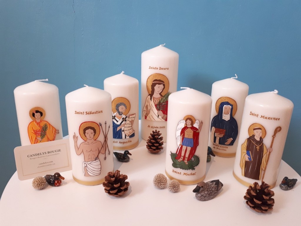 Elisabeth Bertrand peint entièrement à la main sur cierge et bougie, et propose notamment une magnifique collection de saints patrons.