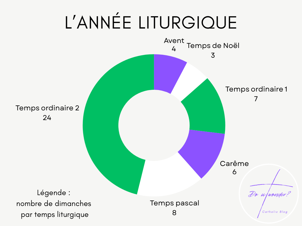 L’année liturgique permet de revivre l’ensemble de l’histoire du Salut et de la vie du Christ, au cours d’une année. Elle se découpe en temps liturgiques qui peuvent être considérés comme des saisons, avec une prédisposition du coeur qui change à chaque temps.