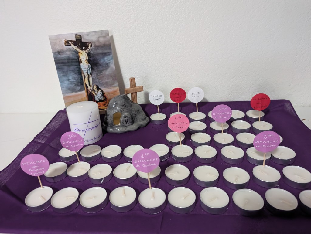 Pour vous aider visuellement à vivre cette année ce chemin de Carême, je vous propose de le matérialiser. Pour cela, trouvez un endroit chez vous pour disposer 40 (ou 46 !) petites bougies type chauffe-plat  que vous pourrez allumer chaque jour lors de votre prière supplémentaire dite « du Carême ».