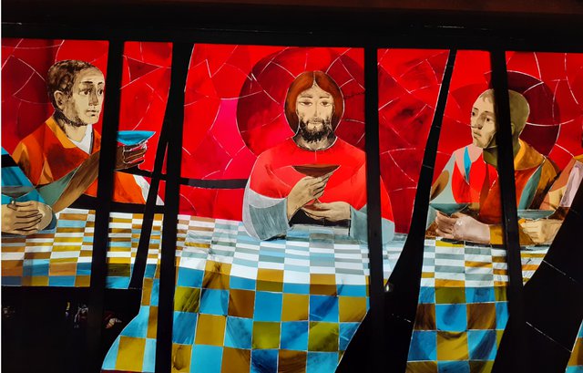 La Cène, vitrail de l’église de l’Alpe d’Huez, Arcabas.