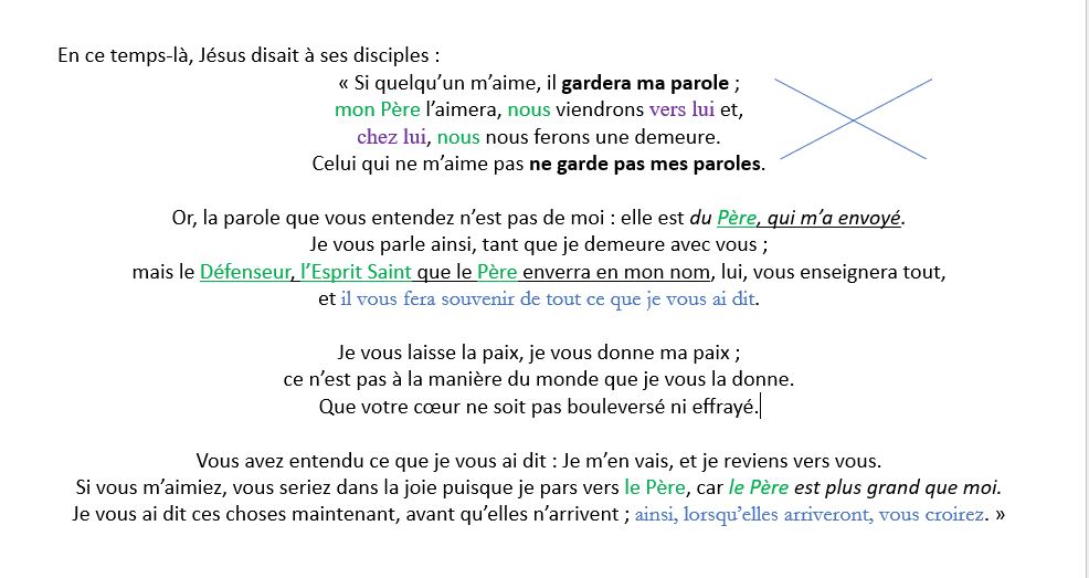 Nous voyons aussi dans ce texte que Jésus reste présent auprès de nous, notamment par sa Parole. Ainsi c’est une véritable catéchèse sur la Trinité qui nous est proposée : Le Père a envoyé le Fils. ll enverra aussi l’Esprit, au nom du Fils, c’est-à-dire en quelque sorte mandaté par le Fils. L’évangile poursuit : L’Esprit est le Paraclet, et St Jean dira ailleurs que Jésus est notre « avocat auprès du Père » (1 Jn 2,1).