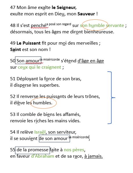 Le texte peut se diviser en trois parties. Dans la première, vous pouvez constater plusieurs mots en gras. Il s’agit de quatre manière qu’à Marie de nommer Dieu : Seigneur, sauveur, Puissant et Saint.