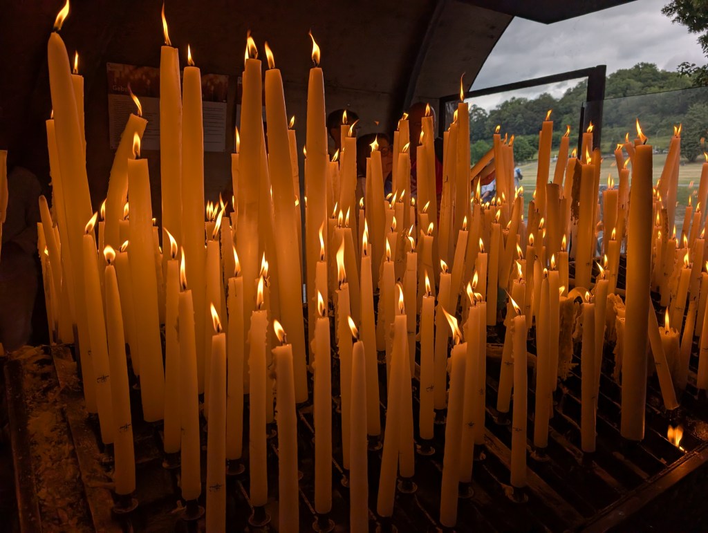 Pour faire sienne l’expérience de Bernadette qui a porté un cierge pendant 15 des 18 apparitions de la Vierge, nous sommes invités à déposer le nôtre en même temps que nos intentions. Lors de la dix-septième apparition, la flamme du cierge que Bernadette tenait en main, lui a léché les doigts sans les brûler.
