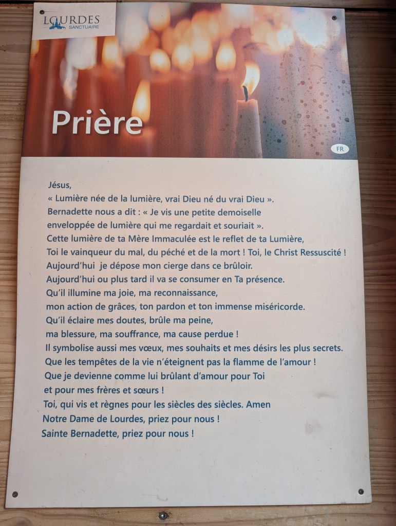 Ce tour dans la ville a été l’occasion pour moi de découvrir que Bernadette n’a pas vu la “Dame”, comme elle l’appelait, une seule fois mais dix-huit fois entre le 11 février et le 16 juillet 1858 ! Vous pouvez retrouver le détail des 18 apparitions sur le site officiel de Lourdes. Et que la ”Dame” n’a révélé son Nom qu’à la seizième apparition en disant en patois local : “Que soy era Immaculada Councepciou” : « Je suis l’Immaculée Conception. »