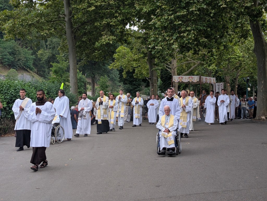 Nous avons ensuite vécu la procession eucharistique. Nous étions invitées à marcher avec les personnes souffrantes derrière le prêtre qui portait l’ostensoir et comme elles à recevoir la bénédiction que Jésus donne en passant au milieu de nous.
