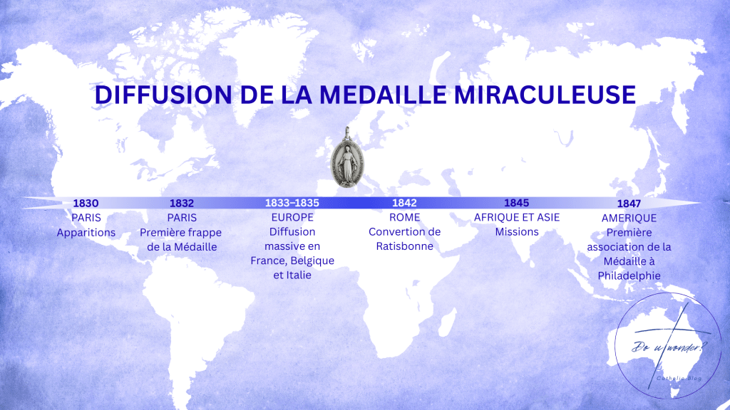 En janvier 1842, à Rome, un jeune banquier israélite nommé Alphonse Ratisbonne, athée et hostile au christianisme, accepte par défi de porter la Médaille Miraculeuse que lui remet un ami catholique. Peu après, alors qu’il visite l’église Sant’Andrea delle Fratte, il a une apparition soudaine de la Vierge Marie, semblable à celle de la médaille. Touché profondément, il se convertit instantanément et demande le baptême quelques jours plus tard. La nouvelle de cette conversion spectaculaire se répand rapidement à travers l’Europe, confirmant la puissance de la médaille et provoquant une immense vague de dévotion mariale. Dès lors, la Médaille Miraculeuse devient connue dans le monde entier.