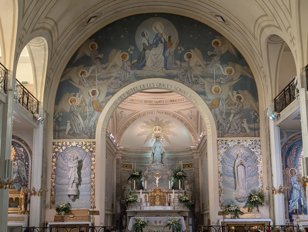 Puis un ovale se forme autour de l’apparition et Catherine voit s’inscrire en demi-cercle cette invocation en lettres d’or :