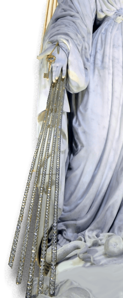 Dans le premier tableau, la Vierge porte dans ses mains un petit globe doré surmonté d’une croix qu’elle élève vers le ciel. Catherine entend :